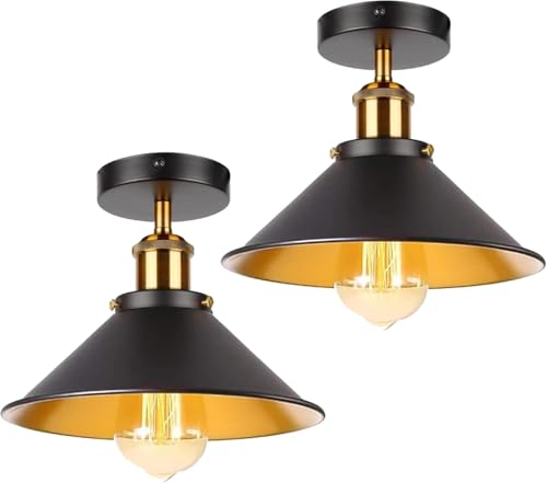 LEDSone Modern Semi Flush Mount Ceiling Light Metal 2 Pack Cone Shape Pendant Lamp Chandelier LED Lights Fitting for Kitchen Bedroom Hallway Restaurant Hotel (Black Inner Gold)