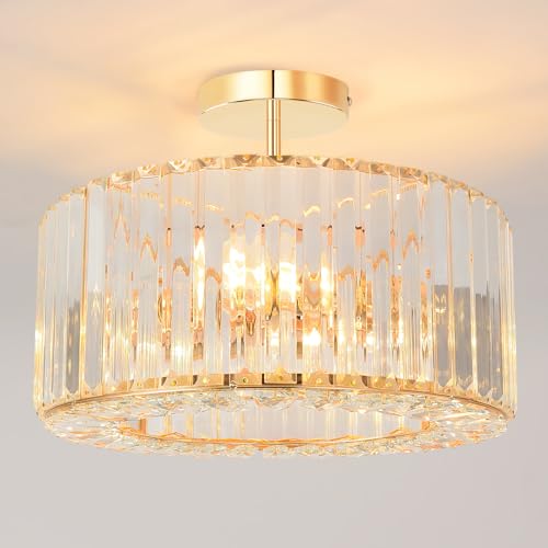ANWIO Gold Crystal Ceiling Lights,3-Light Modern LED Chandeliers Fitting,Industrial Crystal Semi Flush Mount Ceiling Lighting for Hallway Living Room Kitchen Bathroom,Dia 36.5cm,(E27 Base)