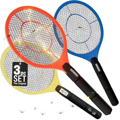 MONZANA® 3x Electric Fly Swatter | Double Safety Net | Battery Operated Insect Killer | Indoor Outdoor Fly Catcher | Handheld Camping Zapper Bat | Tennis Racket Multipack