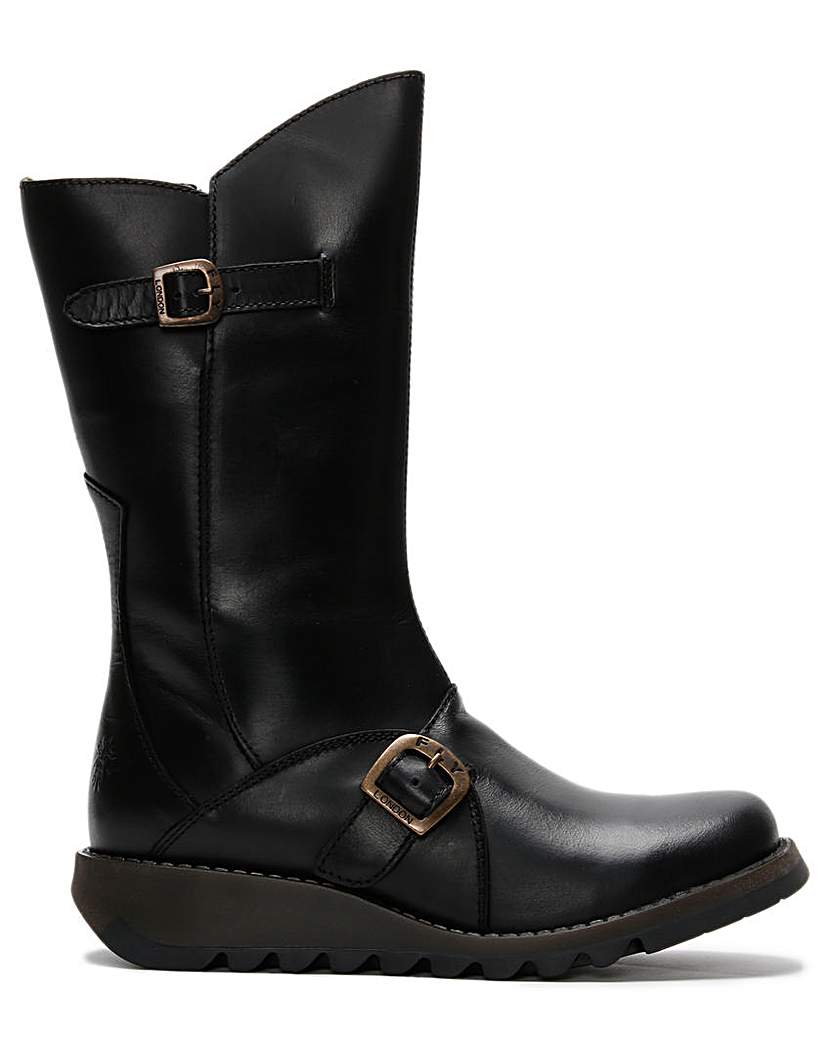 Fly London Womens Black MES 2 Wedge Heel Buckle Mid-Calf Leather Zip Platform Boots - Size UK 8