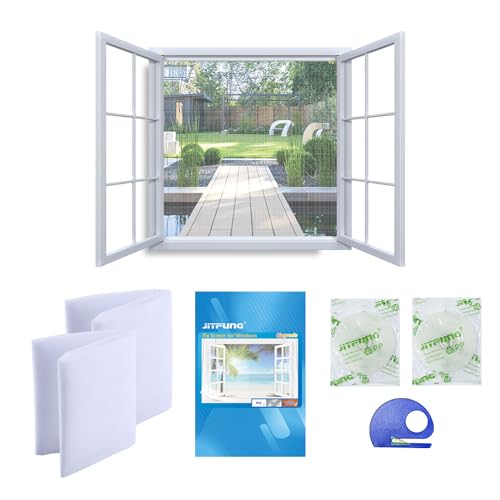 JIT-FUNG DIY Fly Screen for Windows, 2 Packs of Mosquito Net Insect Mesh 130x155CM with 2 Rolls [UPGARDE] Self-Adhesive Tapes & Cutter, White (Square, Set of 2)
