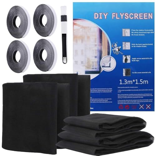 YANGTE 4 Packs Fly Screens for Windows, Insect Mesh Window Nets 130x150 cm with 4 Rolls Self-Adhesive Tapes, Cleaning Brush, Black