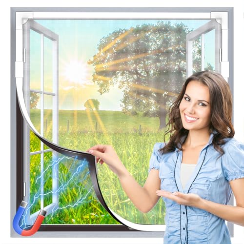 HOFUDON Adjustable Magnetic Fly Screens for Windows, Fit Up to 150x180cm, DIY Fiberglass Insect Mesh for Mosquito Net & Bug Screen, Full Frame Magnetic Strip White Frame Grey Mesh