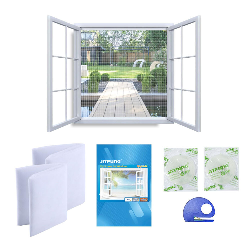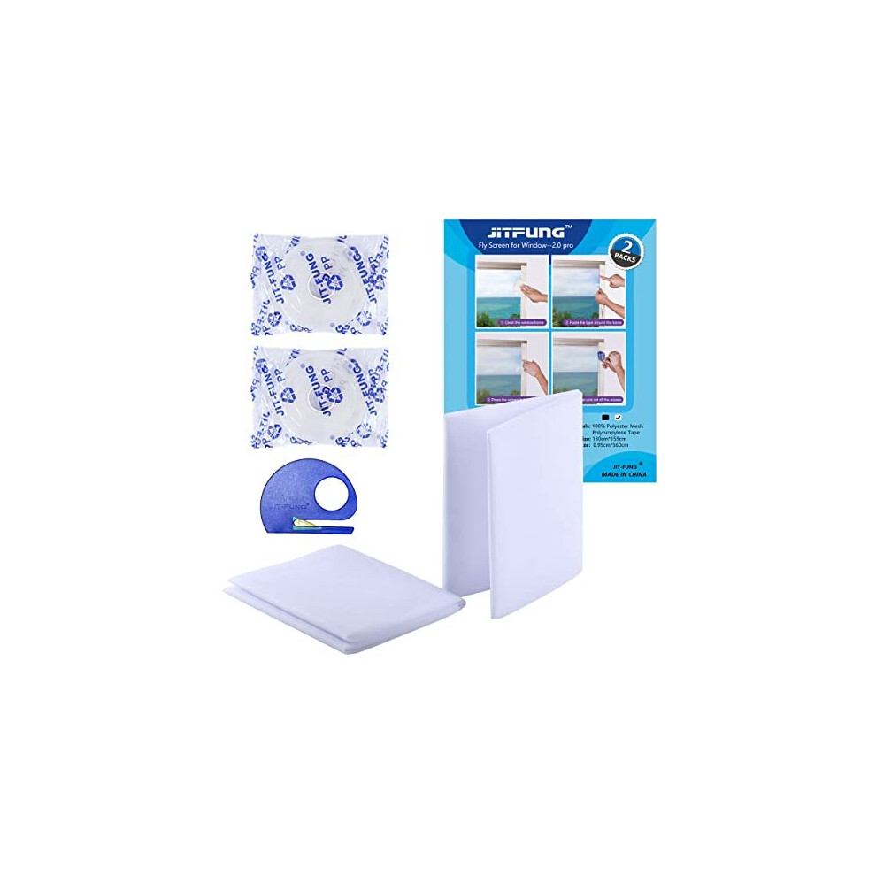 JIT-FUNG DIY Fly Screen for Windows, 2 Packs of Mosquito Net Insect Mesh 130x155CM with 2 Rolls [UPGARDE] Self-Adhesive Tapes & Cutter, White (Square, Set of 2)