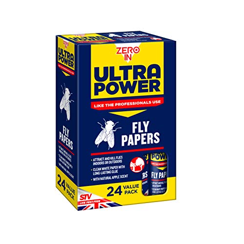 Zero In Ultra Power Fly Papers 24 Value Pack – Poison-Free Sticky Fly Trap Strips with Natural Apple Scent – Catches Over 30% More Flies – Clean White Paper – Indoor & Outdoor Kitchen, Shed & Stable