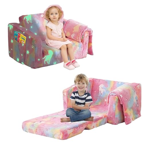 Frcychri Fold Out Toddler Couch - 2-IN-1 Convertible Kids Sofa Bed Glowing Unicorn Rainbow, with Storage Pockets Flannel Foam Filling, Birthday for Girls & Boys (Pink) A,Medium