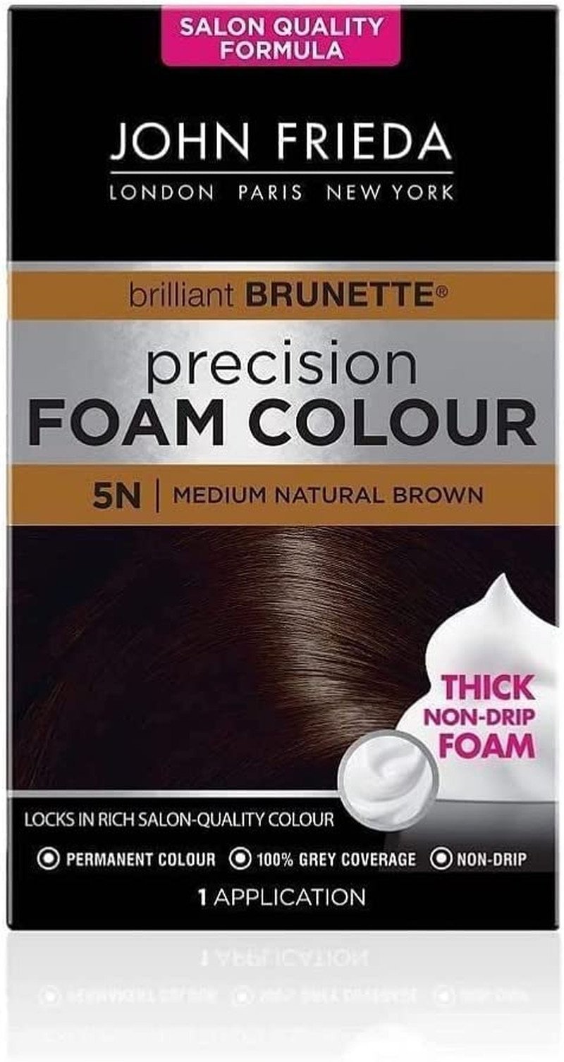 John Frieda Precision Foam Colour Permanent Hair Dye 5N for Salon Quality Finish, 100 percentage Grey Coverage, with After-Colour Conditioner 2344100, Medium Natural Brown, 1 Count (Pack of 1)