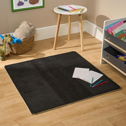 OHS 9 Piece Foam Baby Play Mats 30 x 30cm, Teddy Fleece EVA Foam Interlocking Floor Tile Soft Thick Comfortable Floor Tile Matting for Children Play Crawl Puzzle Mat for Baby, Black