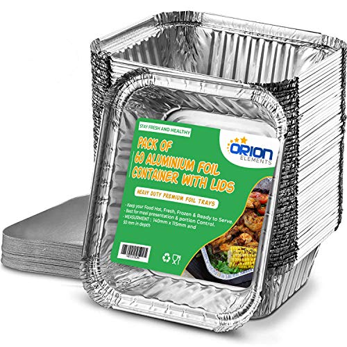 ORION ELEMENTS 60 Premium Small Disposable Aluminium Foil Trays Containers with lids Paper foil Lids 500ml. Best for Meal Prep Baking Food Storage Takeaway Tin (Pack of 60 with Paper Foil Lids)