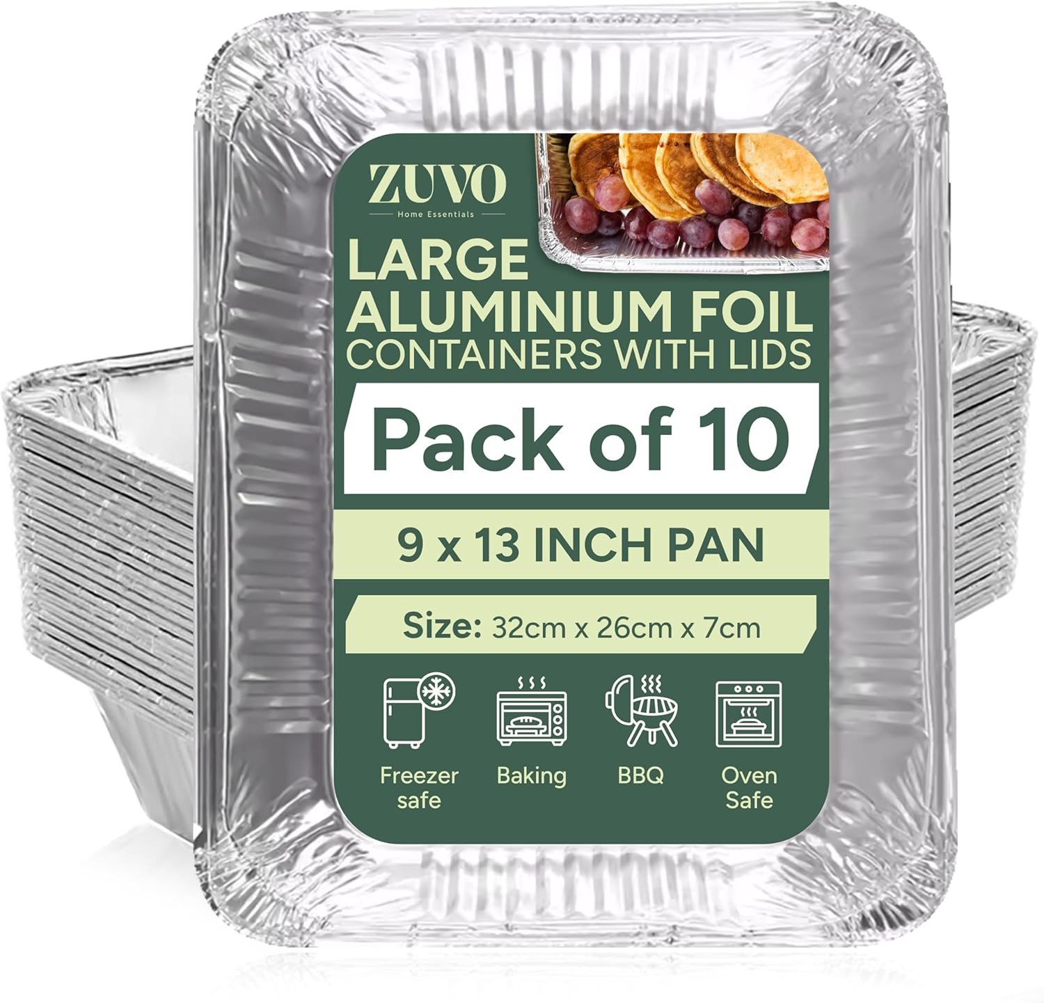 Zuvo - Large Foil Aluminium Trays with Lids 32 x 26 x 7cm (10 Pack) | Heavy-Duty Disposable Food Containers for Cooking, Baking, Roasting, BBQ, Meal Prep & Catering - Oven & Freezer Safe