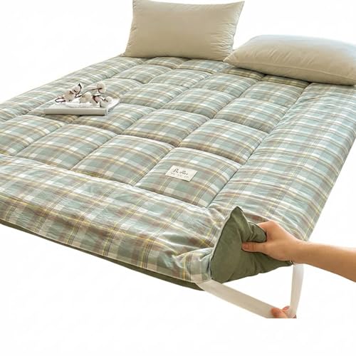 Plaid Duvet Cotton Floor Bed Mattress, Foldable Sleeping Mat for Guest Room, Portable Roll up Camping Pad, Cloud Fabric Gingham Design Fold Away Firm Sleepover Trifold Beds(Green,150 * 200cm)