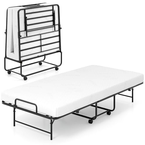 Multigot Folding Bed with 10cm Thick Memory Foam Mattress and Wheels, Portable Rollaway Sleeper Bed, Metal Frame Foldable Single Beds Compact Fold up Guest Beds for Home Office Camping