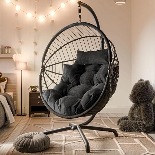Blisswood Rattan Swing Chair for Indoor & Outdoor use - Hammock Hanging Egg Chair with Cushion and Stand - Foldable Wicker Pod Chairs for Garden, Patio or Balcony - Upto 150kg Weight Capacity (Black)