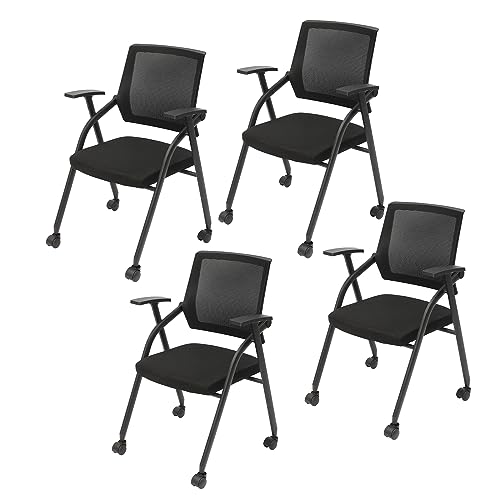 4 Pack Conference Room Chairs, Foldable Mesh Guest Reception Stack Chairs with Caster Wheels & Arms, Executive Office Chairs for Office Meeting Reception Training Room 220lbs Capacity (Black)