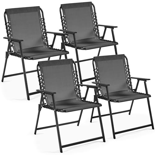 Yaheetech Folding Outdoor Chairs Set of 4 with Metal Frame, All Weather Foldable Dining Chairs with Backrest and Armrest for Garden, Lawn, Yard and Beach, Dark Grey