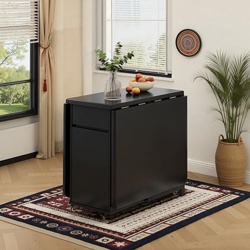 Hearthform Foldable Dining Table and 4 Chairs Set Black Solid Wood Space Saver with Storage Drawers Hidden Compartment Wheels Drop Leaf Design for Small Spaces (130CM Folding Table And 4 Chairs)