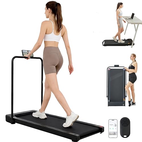 XEO HOME Walking pad with Handles Bar Underdesk Treadmill for Home Office Gym Foldable Electric Running Machine Portable Remote & Bluetooth App Control 2HP 1-10Km/H W. Capacity 120kg/265lbs