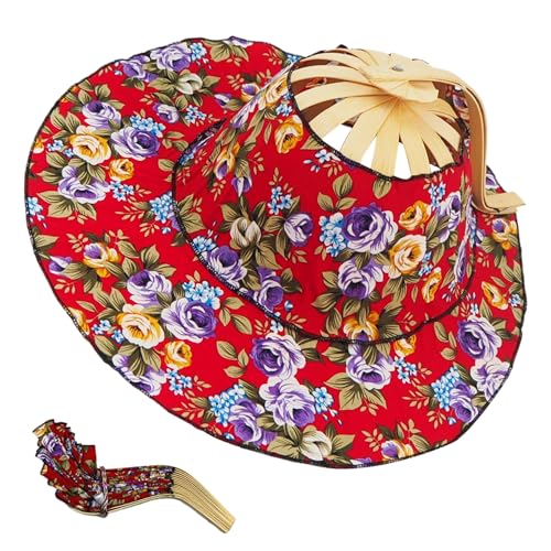 Pesoncarl Fan Hat for Women 2 in 1 UV Protection Bamboo Hat Foldable Floral Bamboo Fan Portable Summer Sun for Outdoor Beach Travel, Red Large Flowers
