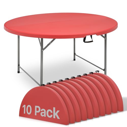 60" Round Folding Table, 5 Feet Foldable Plastic Table Dining Card for Indoor Outdoor Wedding Party, Red, 10 Pack
