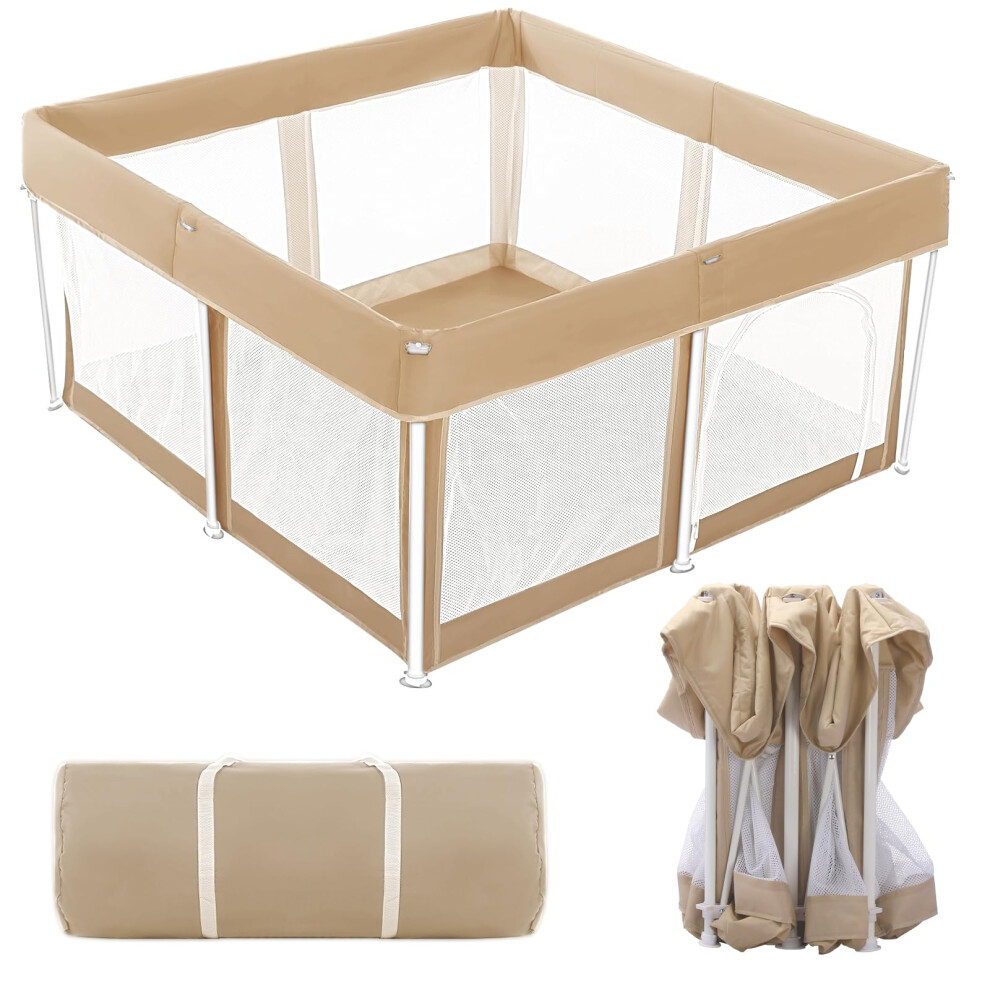 Lexixi Ibao Foldable Baby Playpen, 50"50" Extra Large Collapsible Playpen for Babies and Toddlers, Indoor Outdoor Activity Center with Fence, Khaki
