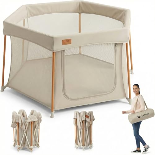 Venture Baby Playpen - All Stars Joy Award-Winning Foldable – Large, Portable Play Pen for Babies & Toddlers, Breathable Mesh & Fitted Mat, Easy to Set Up, Includes Travel Bag - Taupe (6-36 Months)