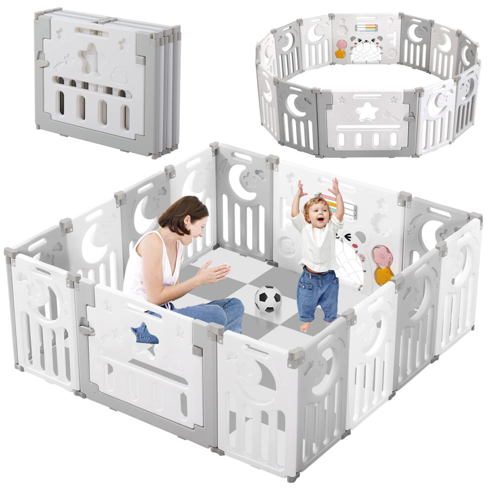 Adventure Lion Baby Playpen for Baby and Toddlers Foldable - Kids Play Pen Babies and Toddlers - Includes Play Mats, Activity Panel, Basketball Hoop & Balls (White/Grey)