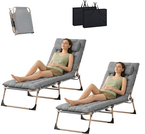 LSBIKE Foldable Sun Lounger Bed Chair with Cushion & bag Set of 2, Extra Wide Folding Sunbed w/Adjustable Backrest, Breathable Oxford Fabric, Portable Sun Lounger for Garden, Patio(Grey, 2pcs)