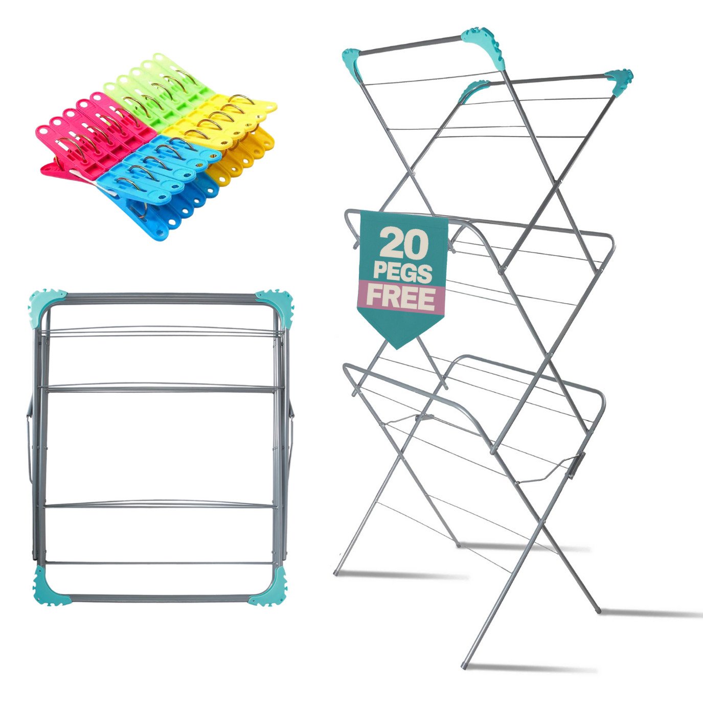 3 Tier Clothes Airer - Foldable Laundry Rack Washing Line with Free 20 Pegs