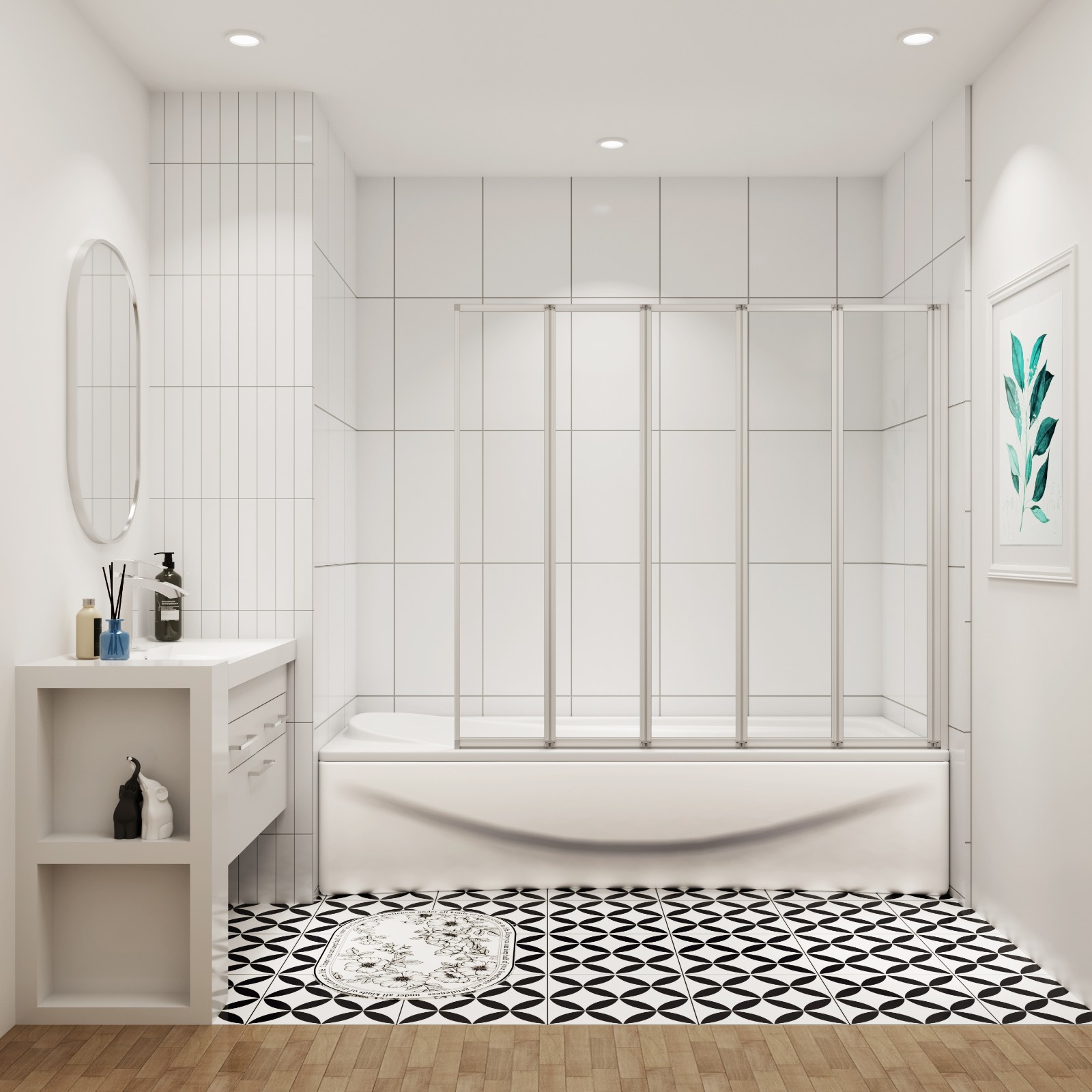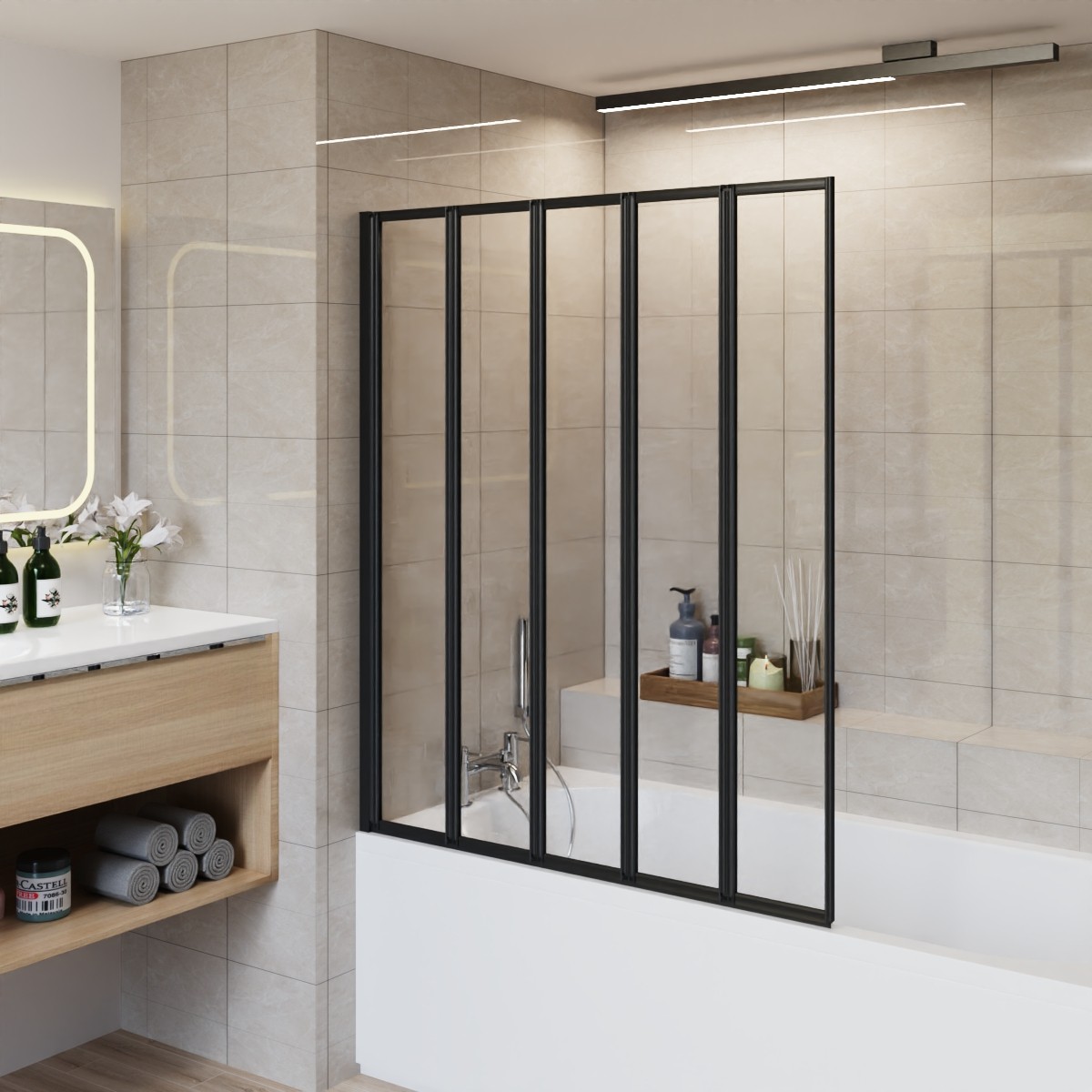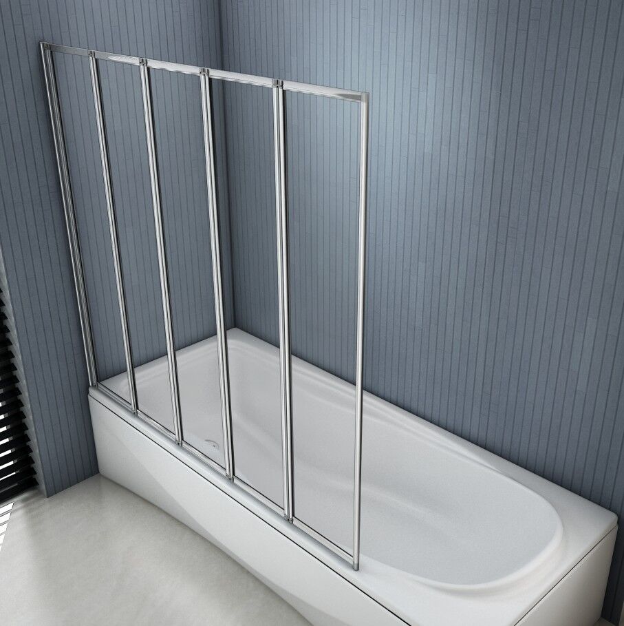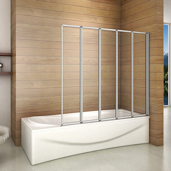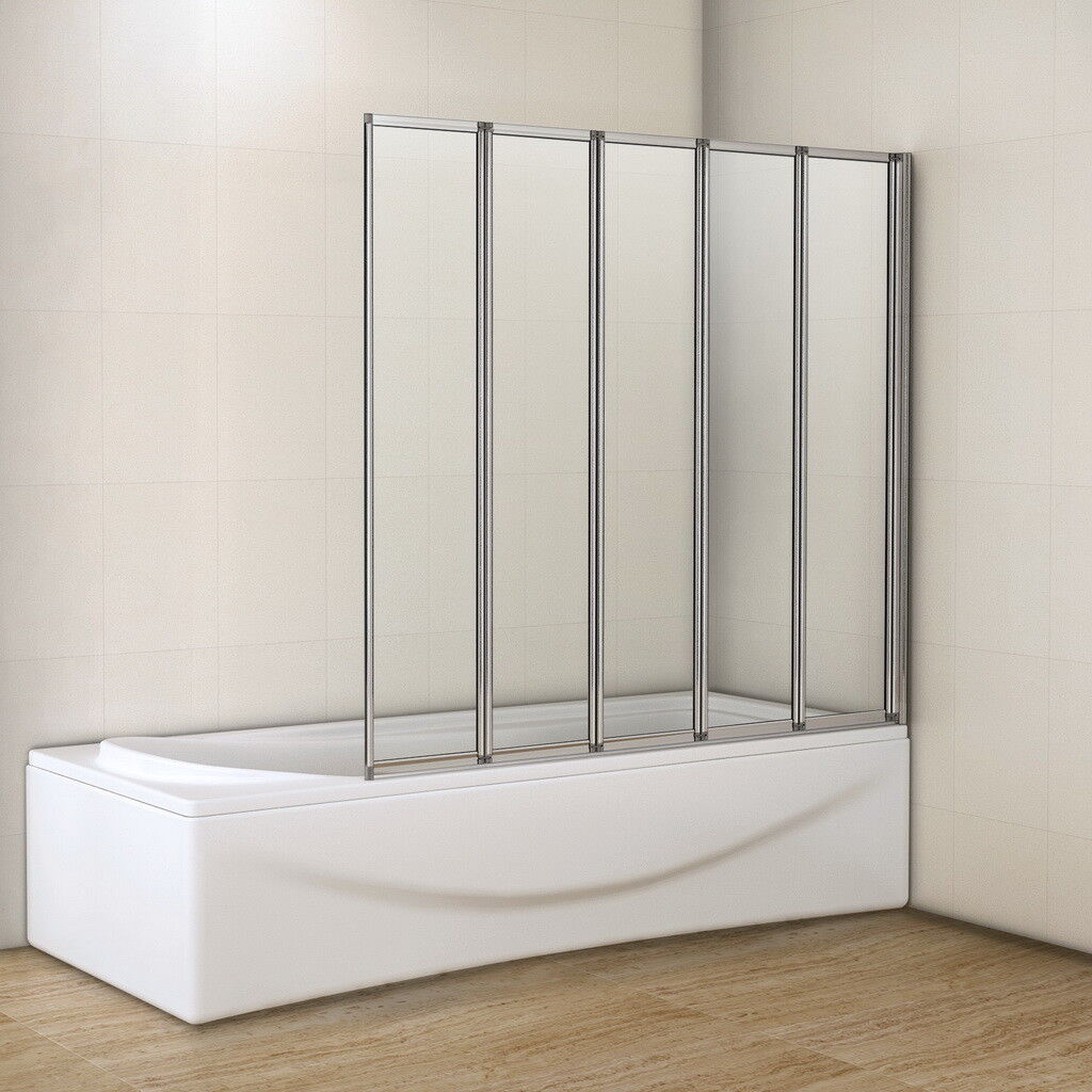 ELEGANT 5 Panel Folding Bath Shower Screen,1200mm Over Bath Shower Screen Door Toughened Safety Clear Glass Bathtub Door Pivot Swing Panel