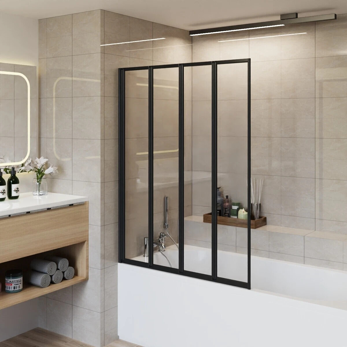 ELEGANT Black 4 Panel Folding Bath Shower Screen,1000mm Over Bath Shower Screen Door Toughened Safety Clear Glass Bathtub Door Pivot Swing Panel