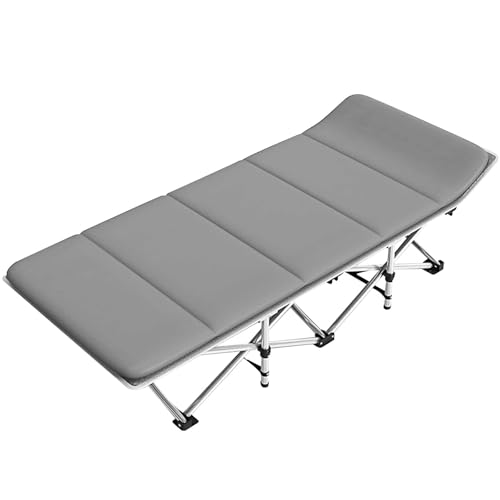 TANGZON Folding Camp Bed for Adults, 27" Extra Wide Padded Camping Cot with Headrest Design & Side Pocket, 180KG Capacity Heavy Duty Sturdy Sleeping Cot Single Person for Travel Beach Office (Gray)