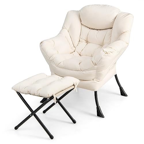 GORELAX Lazy Chair with Ottoman, Modern Accent Chair w/Armrests & Side Pocket, Upholstered Lounge Sofa Chair & Folding Footstool Set, Reading Chair for Bedroom, Living Room, Dorm Room (Beige)