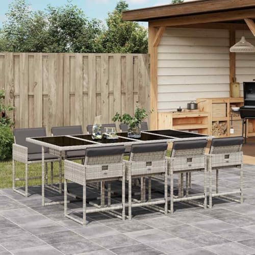 Teenpull 11-Piece Garden Dining Set with Cushions, Grey, Poly Rattan Outdoor Furniture Set, Folding Chairs, Glass Table, for Patio, Balcony, Backyard