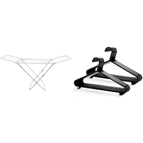 Home Vida Winged Folding Clothes Airer, Metal, White & KEPLIN Adult Plastic Coat Hangers - 25pk, Black Colour, Strong Clothes Hangers
