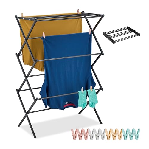 Relaxdays Folding Airer, Clothes Horse, 11 Rails, HWD: 105 x 74 x 37 cm, Laundry Drying Rack, Metal, Space-Saving, Black, Steel, Plastic