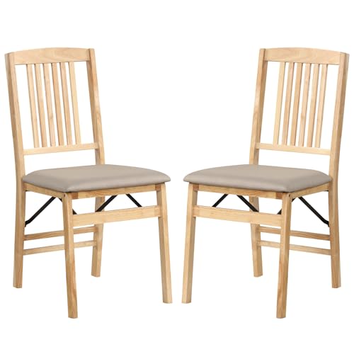 GiantexUK Folding Dining Chairs Set of 2, Padded Kitchen Chairs with Fabric Seat, Back & Rubber Wood Legs, Solid Wood Upholstered Chair for Dining Living Reception Room (Natural + Beige)