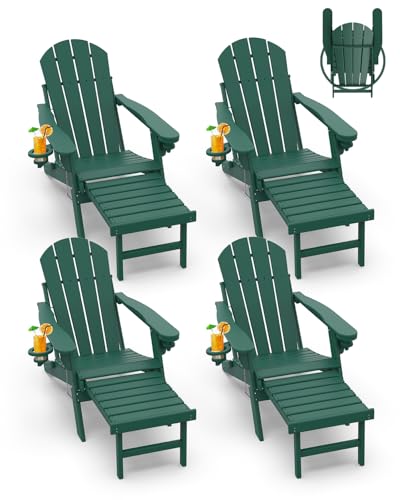 GREENVINES Adjustable Adirondack Chair with Retractable Ottoman Set of 4 | Folding | HDPE Plastic | Fire Pit Chairs w/Foot Rest | 2 Cup Holders | Forest | for Outdoor Patio Poolside Deck