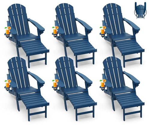 GREENVINES Adirondack-Chairs-with-Ottoman | Set of 6 | Folding | Retractable-Footrest | HDPE Plastic | All Weather Fire Pit Chair | Cup Holders | Blue | for Outdoor Poolside