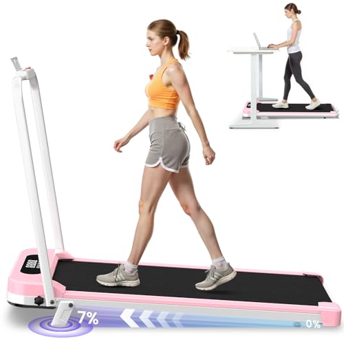 Under Desk Treadmill Incline Adjustable Foldable App Remote Control 4 in 1 Folding Walking Running Pad Machine Adjustable Speeds LED Display for Home or Office with Holder (PINK)
