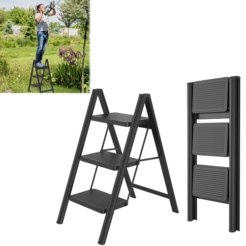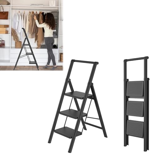 WSCMDYY 3 Step Folding Ladder, Non-Skid Wide Pedals, and Handrail, Lightweight, Household Ladder for Home, Kitchen, Pantry, Closets, and Office Use, Black black