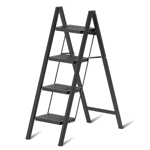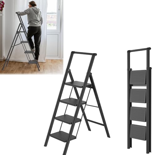 EOXCIIU 4 Step Ladder, Folding 4 Step Ladder Lightweight, Wide Steps, Portable and Load Capacity-150kg, Step Distance-24cm, Iron, Black