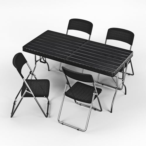 URBN GARDEN 5FT Black Rattan Wood Look Folding Table with Folding Chairs Set Indoor and Outdoor Portable Dining Furniture for Home, Garden, Patio, and Events