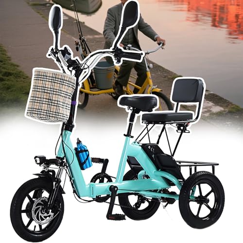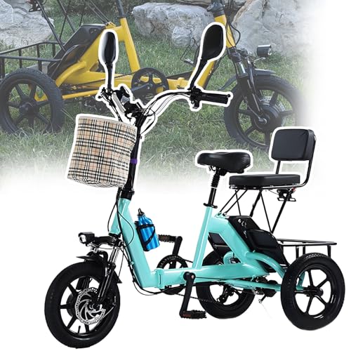 HpLNDas Folding Electric Power Tricycle for Adults, 14 Inch Three Wheel Electric Trike With Passenger Seat/Big Basket, Foldable Bicycle, 48V 10.AH Lithium Battery, Max Load: 180KG Green
