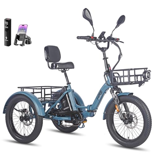 Fafrees F20 Mate Electric Tricycle for Adults, Electric Bike 48V 18.2Ah Removable Battery, 70km Range, 20 x 3.0 Fat Tires, Folding Electric Trike (Blue+Front Rack Basket+Enlarged Rear Basket)