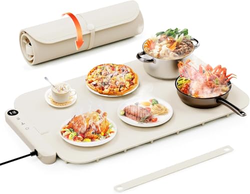 Food Warming Mat-Foldable Electric Warming Mat for Food Sillicon Food Warmer with Adjustable Temperature Control Time Moders Locking Function Warming Tray for Buffet,Party White