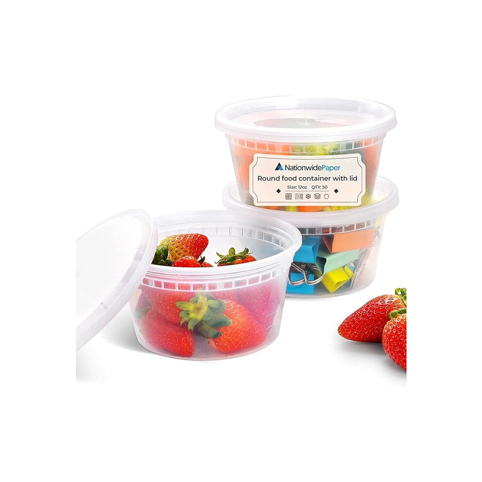 (50) Nationwide Paper 12oz Round Plastic Takeaway Microwave and Freezer Safe Meal Prep Food Containers with Lids, BPA Free (355ml)