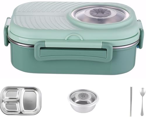 1100ml/38.7Oz Lunch Box,Kids Bento Lunch Box With Compartments,Stainless Steel Toddler Adult Lunch Boxes,Salad Lunch Boxes for Hot Food Storage,Meal Prep Containers with Cutlery,Thermos (Green)