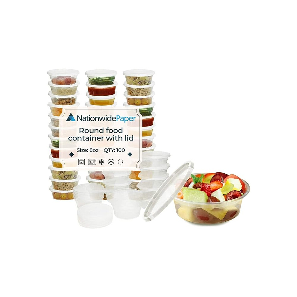 Nationwide Paper 8oz – 100 Pcs Round Plastic Takeaway Microwave and Freezer Safe Meal Prep Food Containers with Lids, BPA Free (240ml)