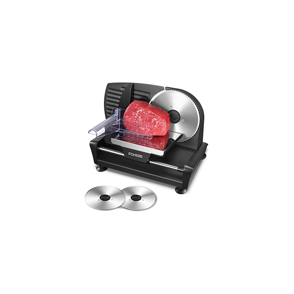 FOHERE Electric Meat Slicer Machine 200W for Home Use, with 2 Removable Stainless Steel Blade(Smooth/Serrated) and Food Pusher, Safety Switch, 0-15mm