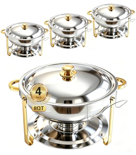 Beviliu 9 Litre Chafing Dish Buffet Set, 4 Pack 8QT Round Chafing Dishes & Food Warmers, Gold Chafing Dishe for Buffet, Stainless Steel Chafer for Catering Lid & Lid Holder, Food Warmers for Partie